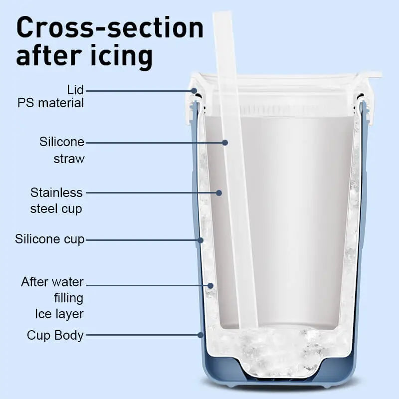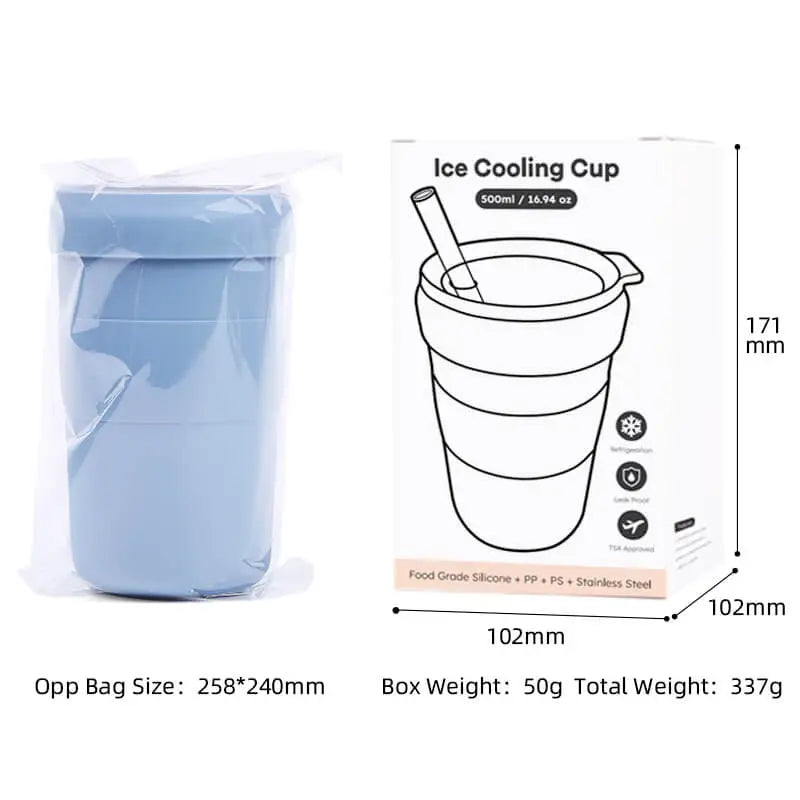 Stainless steel and silicone dual-purpose portable cooling ice cup, made of food-grade silicone and 304 stainless steel. It has complete certifications(FDA,CPC,BPA FREE,LFGB, etc.)and complies with European and American market standards. Available on platforms such as Amazon.